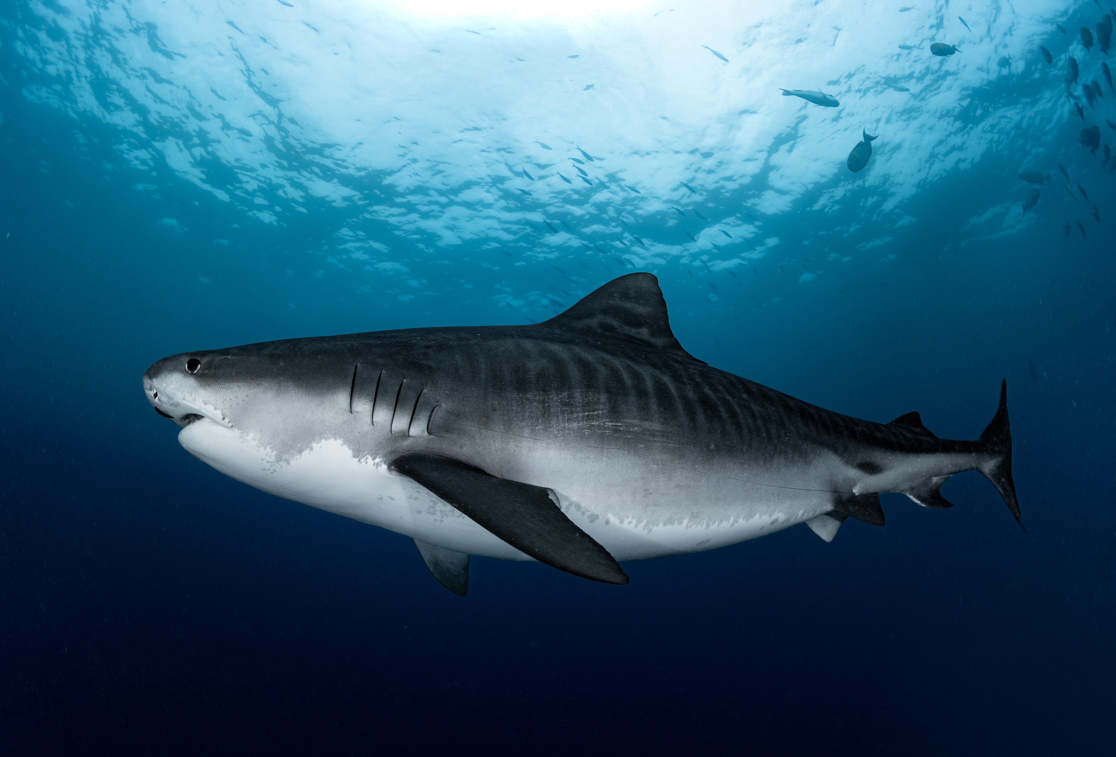 In addition to tiger sharks, divers may encounter thresher sharks, scalloped hammerheads, silky sharks, silvertip sharks, oceanic whitetips, manta rays, and seasonal whale sharks. Schools of jacks, tuna, barracuda, and large reef fish create dynamic, action-filled dives in clear blue water.